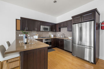 Sky Lofts is at the epicenter of DTLA in the South Park District. Perched high above the city on the 15th floor at 801 S Grand Ave, this 2-bedroom, 2-bathroom, 1,220 square foot loft-style condo offers a seamless blend of modern finishes, open-concept living, and exciting skyline views. This south facing unit has floor to ceiling windows, letting natural light spill in to create an ideal backdrop for both day-to-day living and evening entertaining. 10 foot high ceilings add to the loft style vibes. The kitchen is open to the living room with a breakfast bar/island with plenty of storage and seating capability. Off of the living room there is primary bedroom suite with spacious ensuite bathroom that includes a double vanity, a large tub and separate walk-in shower. Attached to the bathroom is a large walk-in closet. The 2nd bedroom is perfect as an office or guest bedroom and situated next to the 2nd full bathroom off the entryway. There are light hardwood floors throughout the unit giving it a modern and bright vibe. In addition, there is an in unit washer and dryer closet and central heat and air conditioning. The list of building amenities are impressive - a premium updated gym, a movie/media room with comfy theatre style seating, a clubhouse/entertainment room with a full kitchen that can be booked for events and a 24 hour security desk in the lobby. The unit includes two side by side parking spaces in the underground garage. There is a separate garage on site with ample visitor parking for guests.